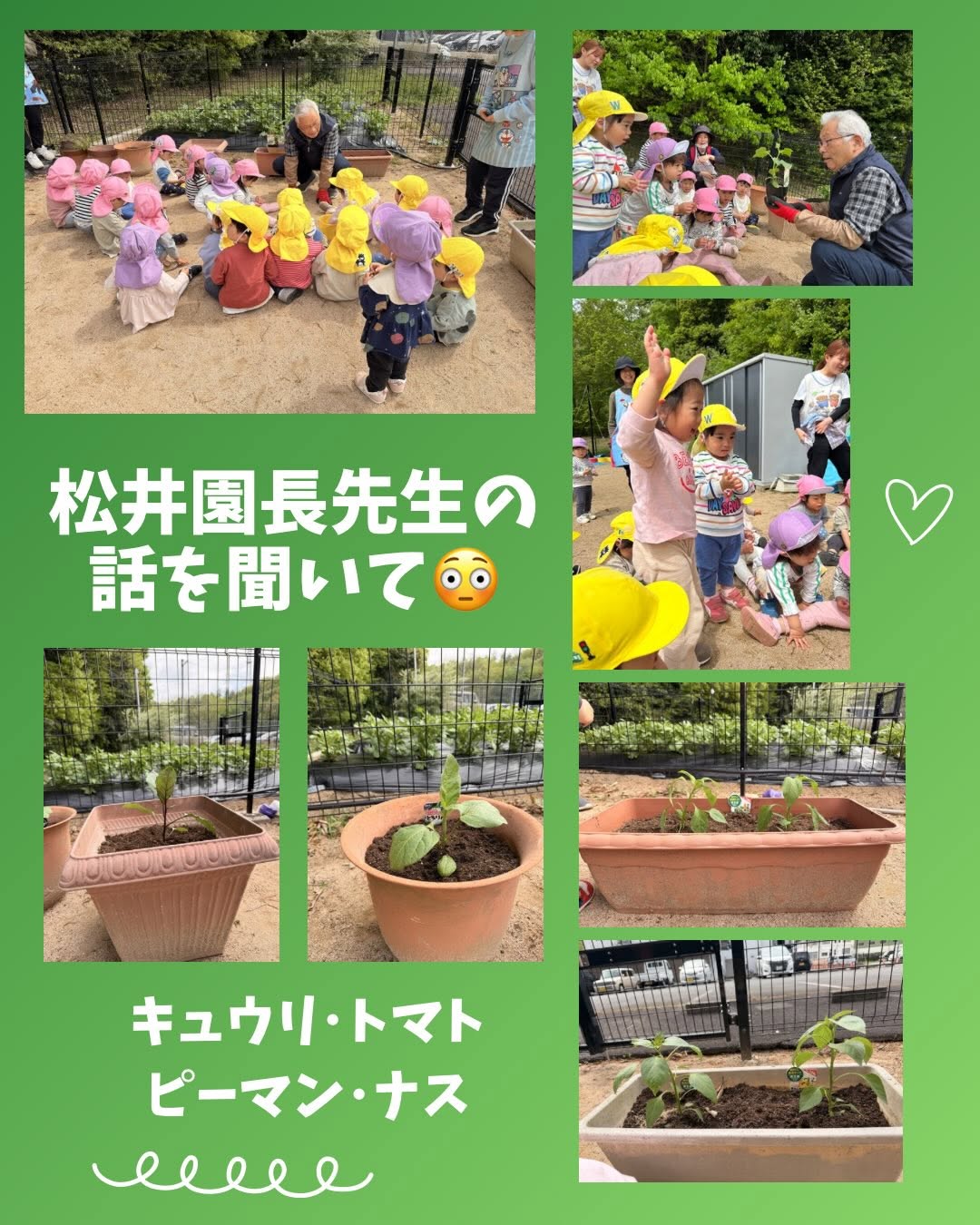 きゅうり・ナス・ピーマン・トマトなど、いろいろな野菜の苗に興味津々の子どもたち😊